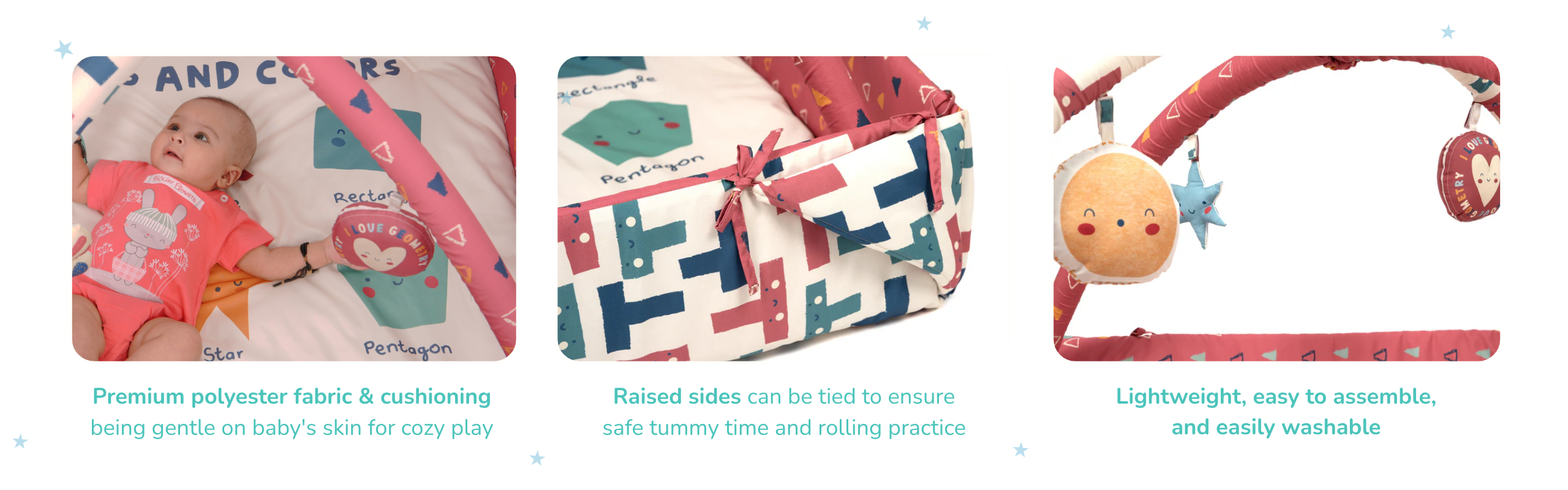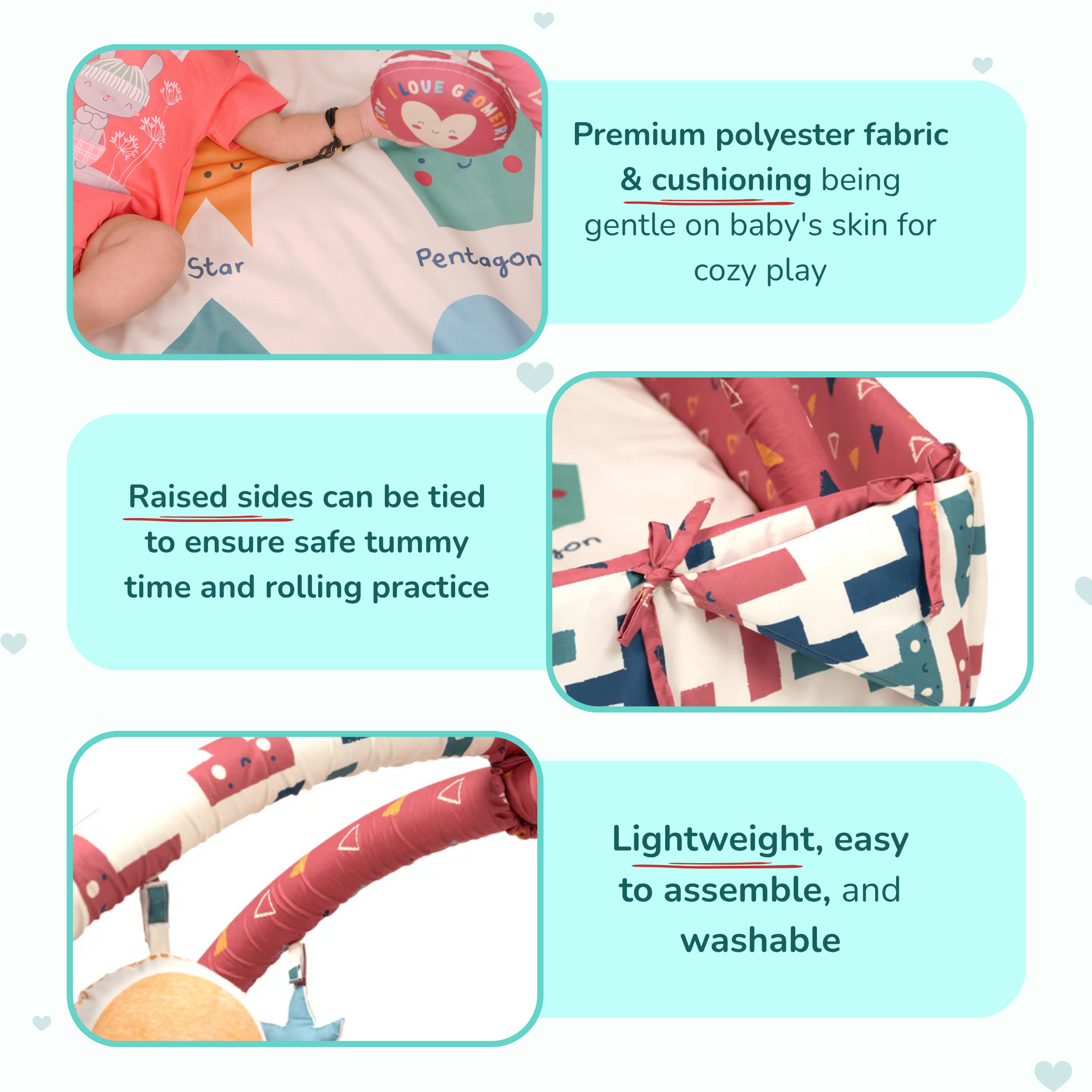 • Raised sides can be tied up to create a snug, enclosed area for safe tummy time and rolling practice
