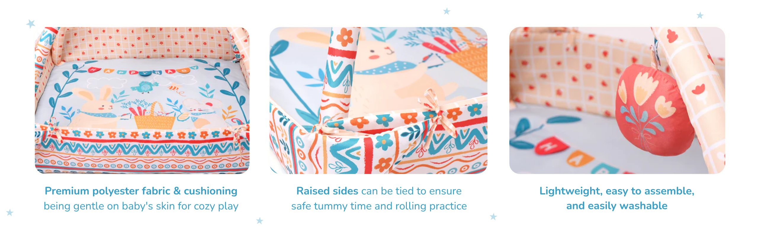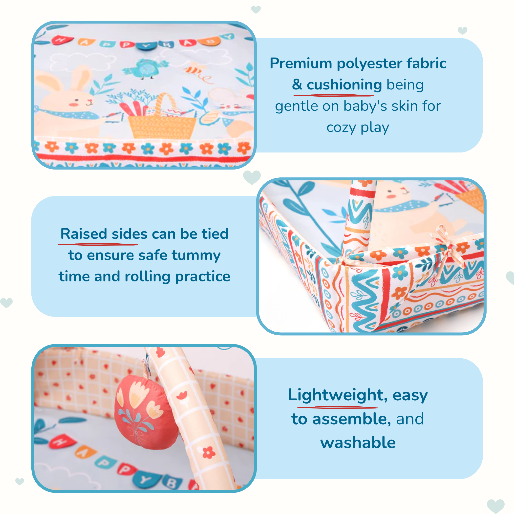 • Raised sides can be tied up to create a snug, enclosed area for safe tummy time and rolling practice