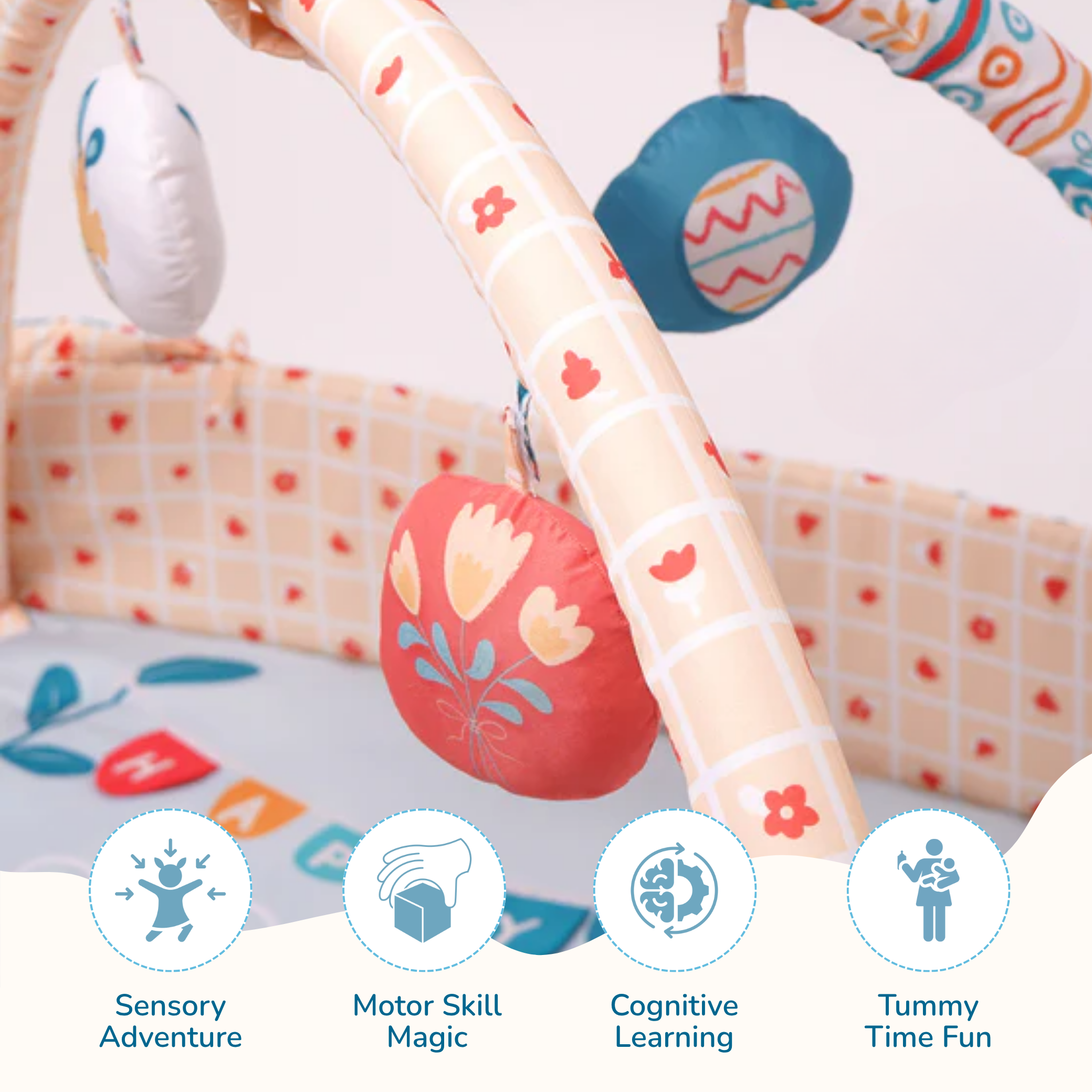 The sensory toys and soft textures stimulate early brain development. While your baby practices reaching, rolling, and grabbing, they develop essential motor skills and coordination.