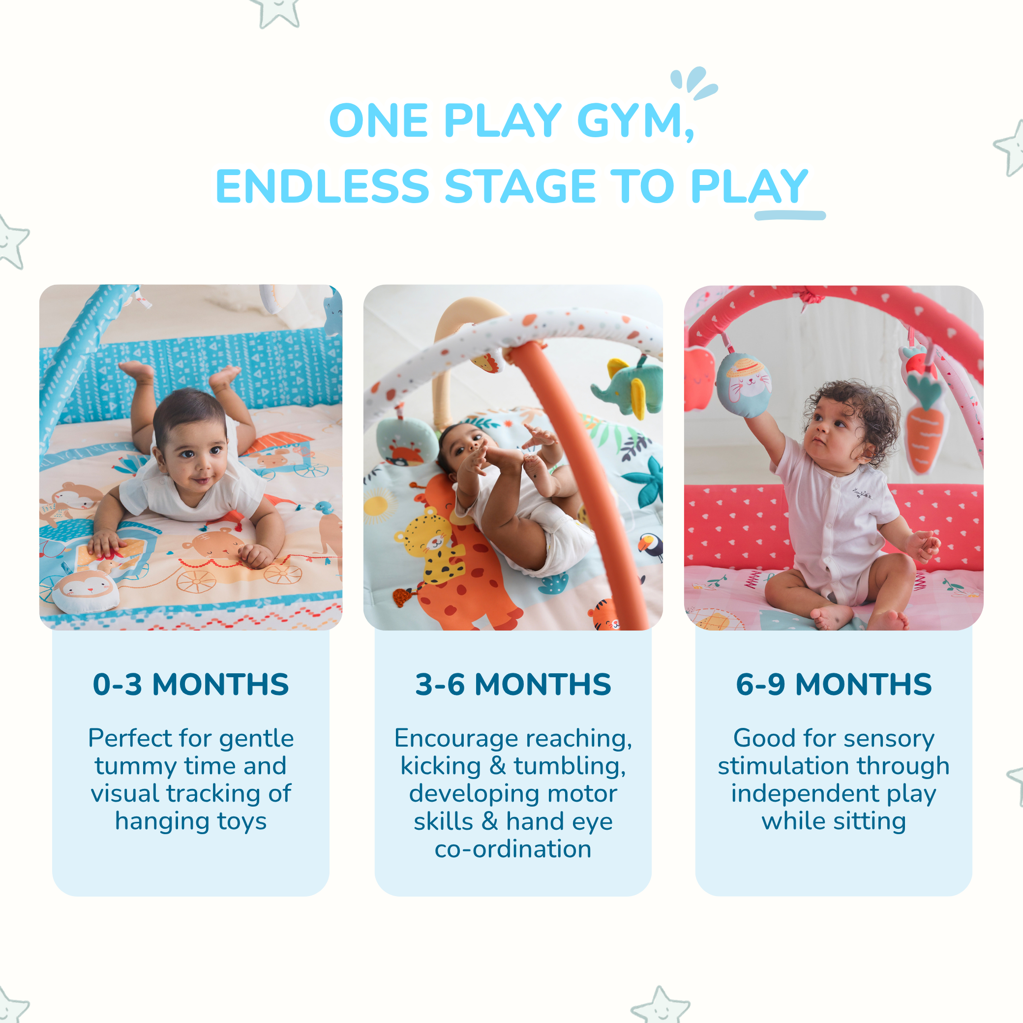 Play gyms promote motor skills, hand-eye coordination, and sensory development. They also provide a safe space for tummy time and independent play