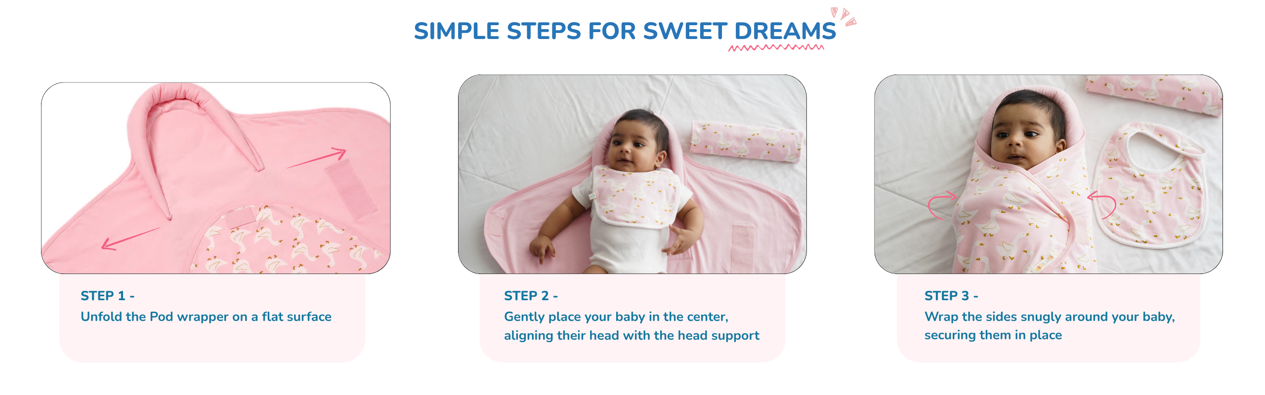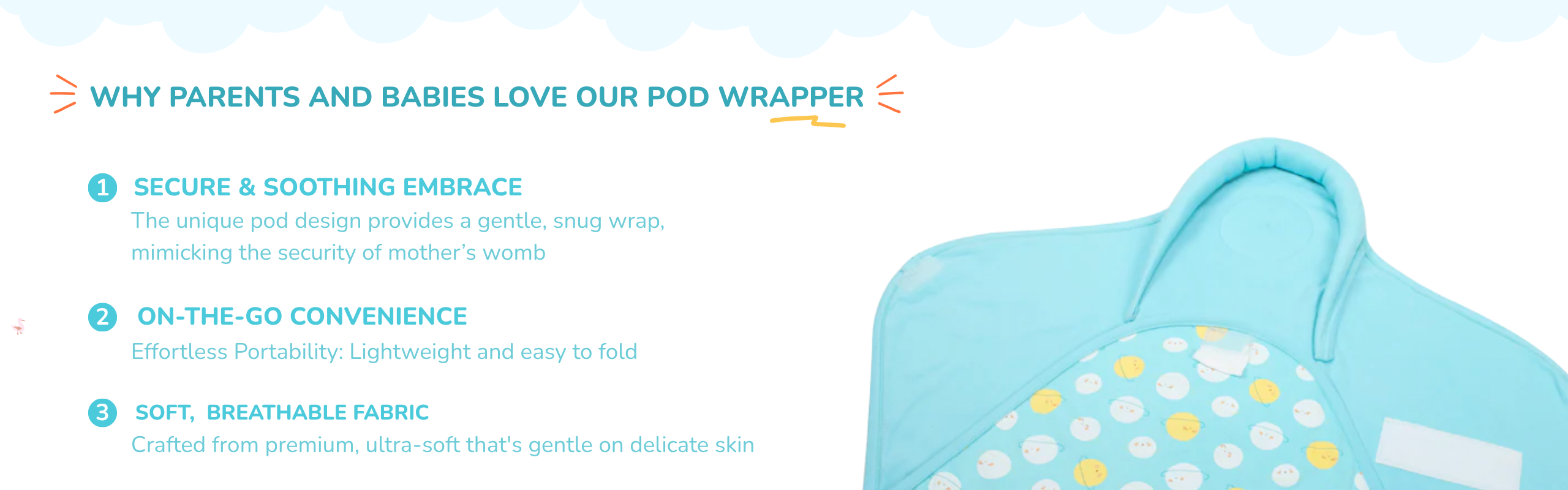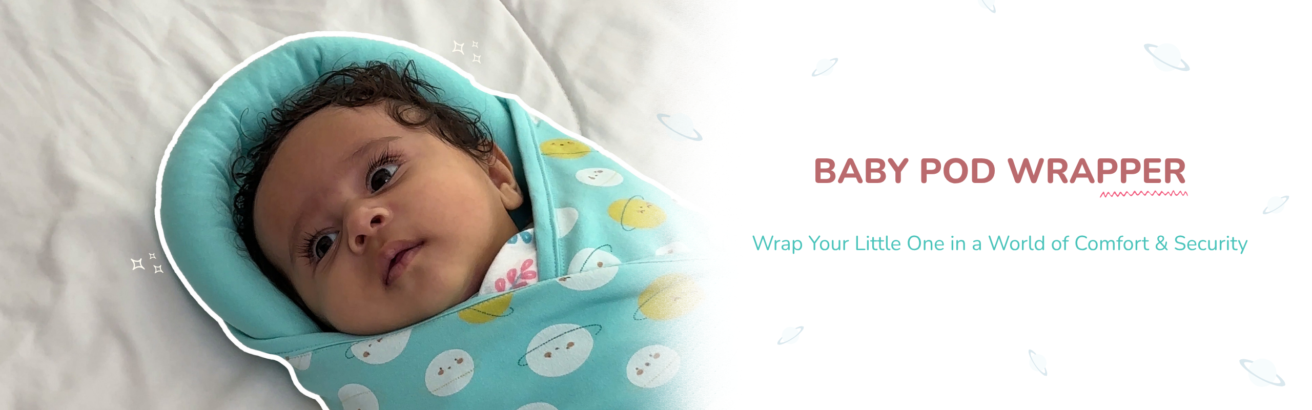 Pod Wrapper is a soft, cocoon-style wrap designed to gently hug your newborn and give the cozy feel of the womb. It keeps your baby snug, warm, and secure during bedtime.